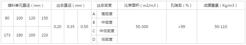 该填料筛选了聚烯烃类和聚酰胺中的几种耐腐、耐温、耐老化的品种,混合以亲水、吸附、抗热氧等助剂,采用特殊的拉丝,丝条制毛工艺,将丝条穿插固着在耐腐、高强度的中心绳上,由于选材和工艺配方精良,刚柔适度,使丝条呈立体均匀排列辐射状态,制成了悬挂式立体弹性填料的单体,填料在有效区域内能立体均匀舒展满布,使气、水、生物膜得到充分混渗接触交换,生物膜不仅能均匀地着床在每一根丝条上,保持良好的活性和空隙可变性,而且能在运行过程中获得愈来愈大的比表面积,又能进行良好的新陈代谢,这一特征与现象是国内目前其他填料不可比拟的。