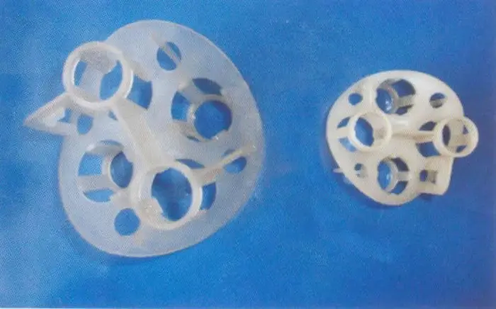 塑料花环填料是由美国Teller.A.j.1954年介绍的一种填料,国内通称泰勒花环。它是由许多圆环绕结而成,现已成为系列化产品,共有三个型号。这种填料的主要特点是填料的空隙率大,不易被堵塞,还有通量大、阻力小等优点,由于这种填料的间隙处能有较高的滞液量,可使塔内液体停留时间较长,从而增加了气液的接触时间,提高了效率,故此冶金工业部首先研究并引进美国填料公司的塑料花环,制定为冶金工业部专用推广填料。