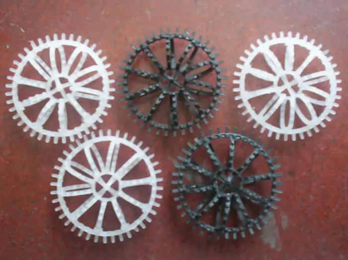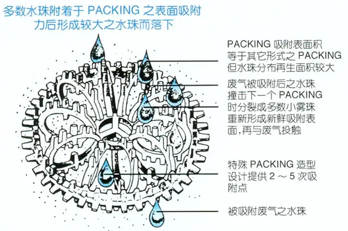 PT拉西环德填充材是一种率,低压损的填充材,外形犹如螺丝缠绕而成,当溶液与污染空气相对冲击形成雾状之小水滴包围整个填充材所以其效果不仅靠表面吸附,其吸附效果与管形填充材,马鞍形填充材在压降与容积都较好,所以特拉端德填充材在同等体积下可降低40%~50%之静压损失,在同等压降下体积可减少35%~50%,且空隙率大物质移转系数高,其处理效率比其它型填充材提高26%~35%;其材质可为PVC,PP,CPVC供选择使用,并能符合新半导体法规。