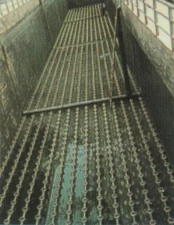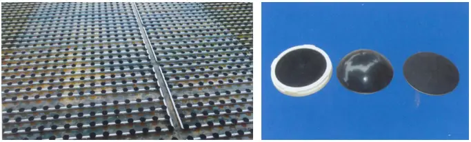 曝气器尺寸I型D=215MM,Ⅱ型D=260MM,曝气膜片运行平均孔隙80-100μm,空气流量1.5-3m3/个·h,服务面积I型O.25-0.5m2/个、Ⅱ型0.35-75m2/个,氧利用率(水深3.2m)18.4%-27.7%,充氧力0.112-0.185KgO2/m3.h,充氧动力效率4.46-5.19KgO2/KW.h,曝气阻力2.75Kpa。空气管设计应考虑压力平衡,联成环网,每组进气支管应设置阀门,便于调节空气量。 空气管设计流速: 干管为lO-15m/s;支管为5m/s曝气管表面距池底安装高度为:I型250MM,Ⅱ型270MM,推板式为200MM。